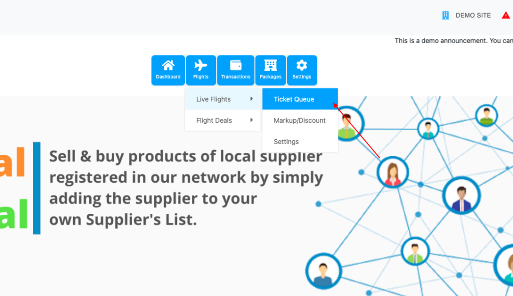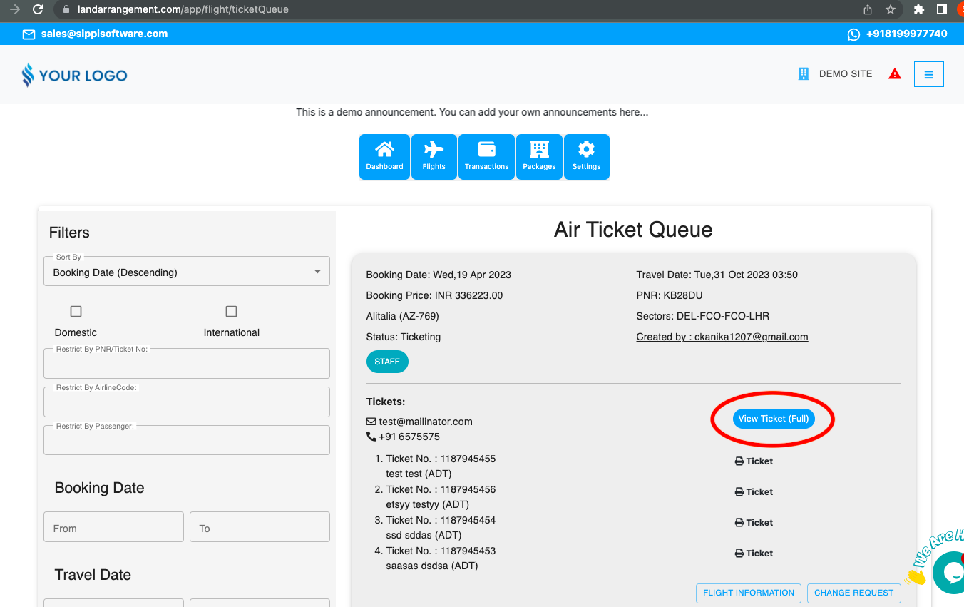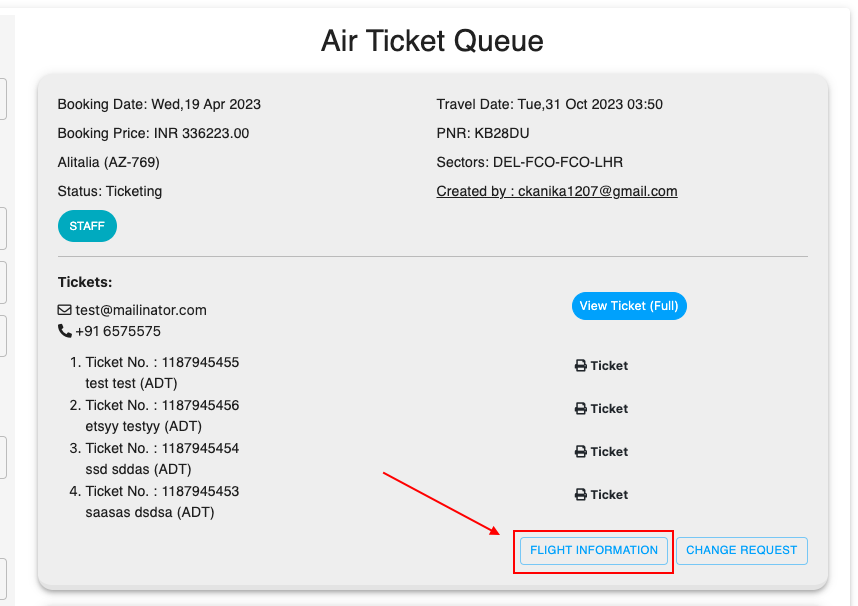 Admin login on your site > Dashboard > Flights > Live flights > Ticket queue.